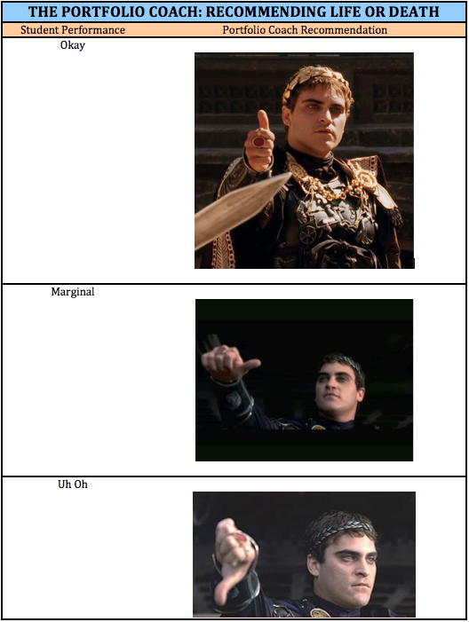 Oh yeah. Portfolios. The “portfolio coach” is a faculty-person who reads all of your evaluations and sees all of your grades. They’re responsible for synthesizing a Portfolio Coach Evaluation (again, caps), a document basically designed to give an Emperor Commodus-style recommendation to The Promotions Committee about our fitness to advance.