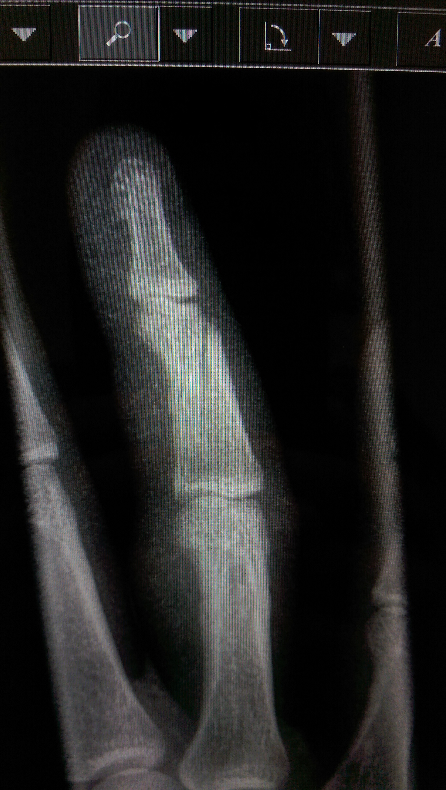 This is a “mildly comminuted and slightly displaced complete transverse fracture of the middle phalanx of the right 4th finger, with associated soft tissue swelling.” In translation I snapped my finger in half like a Q-tip.