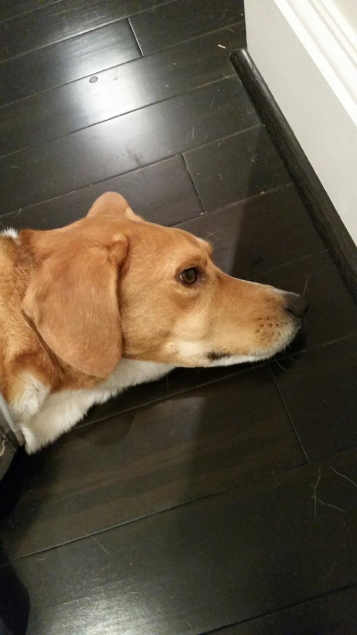 As you can see, Tiller is higher than a weather balloon in this photo. In case you can’t tell, his gaze is directed squarely at the wall. He was probably having crazy dog dreams about killing more rabbits.