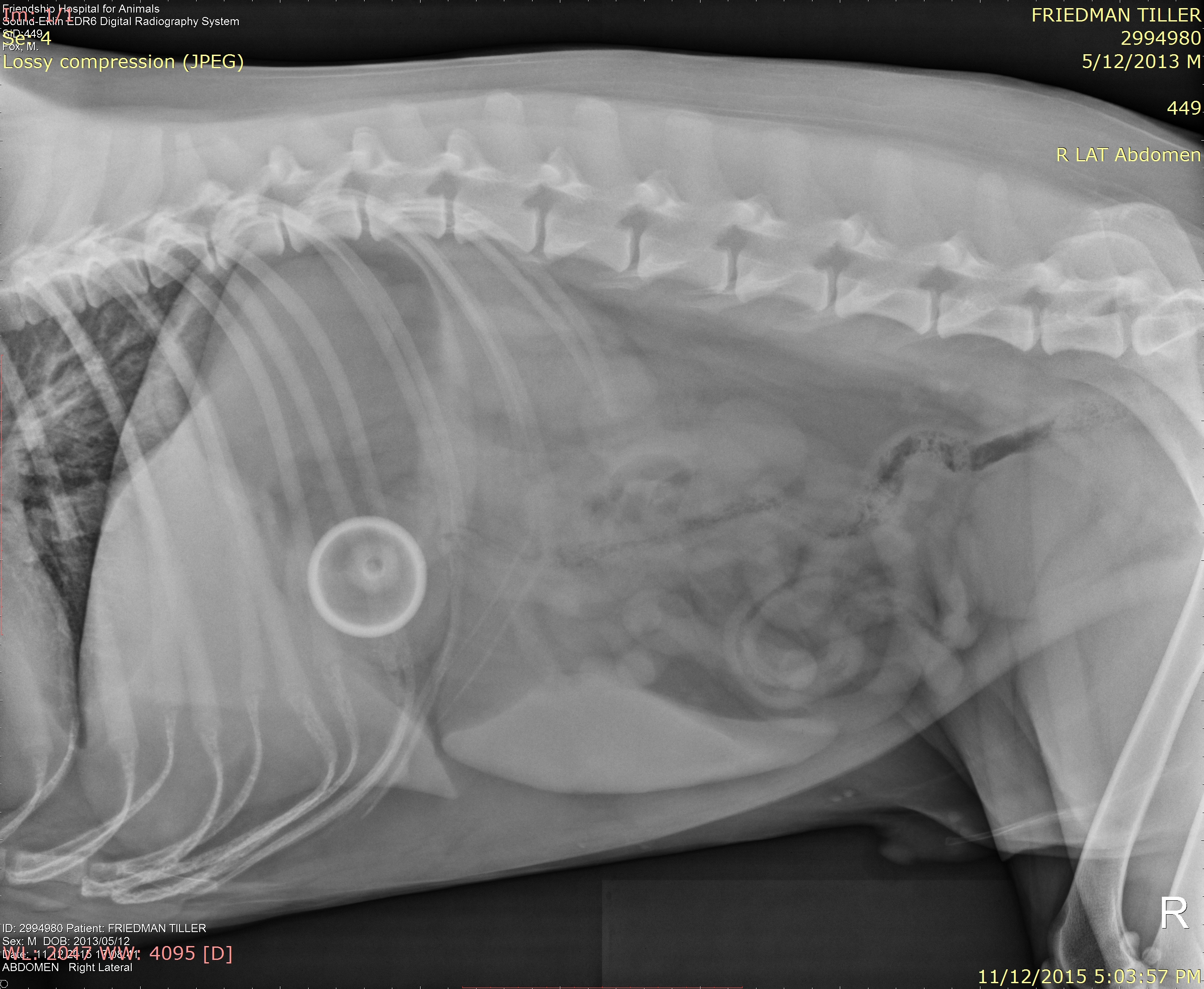 About a week ago, Tiller (who lives with my parents back in DC) got sick. He started throwing up and looked bad, so my mom took him to the vet. They took an X-ray, which showed the following: