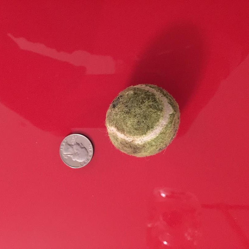 The quarter is for scale. My IDIOT dog somehow decided it was both possible and a good idea to swallow an entire, inflated tennis ball. What the hell!? How did that go down? How could he possibly have eaten this without anyone noticing? How does one “eat” a rubber ball at all!?