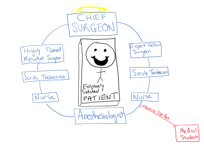So we use central lines a lot, especially in the ICU. The procedure is a little bit complicated and carries a pretty real risk of infection or other issues, which primarily means the medical student is to be kept as far away from the procedure as possible, ideally in the next zip code. I will refer to you an image from second year of medical school depicting safe procedural positioning: