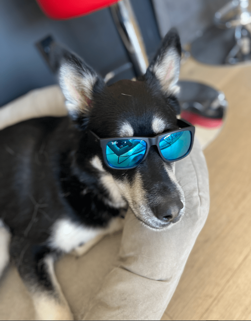 Here’s a picture of Otis reluctantly wearing my sunglasses.